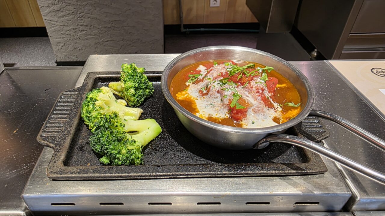 自分の座った席の様子さて、ハンバーグ1つが自分の鉄板に置かれました!ハンバーグは2つ選べて牛肉(和牛)か鶏肉か、そして味付けでオリジナル、チーズ、期間限定かを選べることができます。私が行ったときは期間限定メニューとして「クリーミートマトソース」味が選べました。悩みましたが、今回はどちらも牛肉で、オリジナル1つ、クリーミートマトソース1つを選ぶことにしました。しかし、和牛ハンバーグが食べられるなんて贅沢ですね!